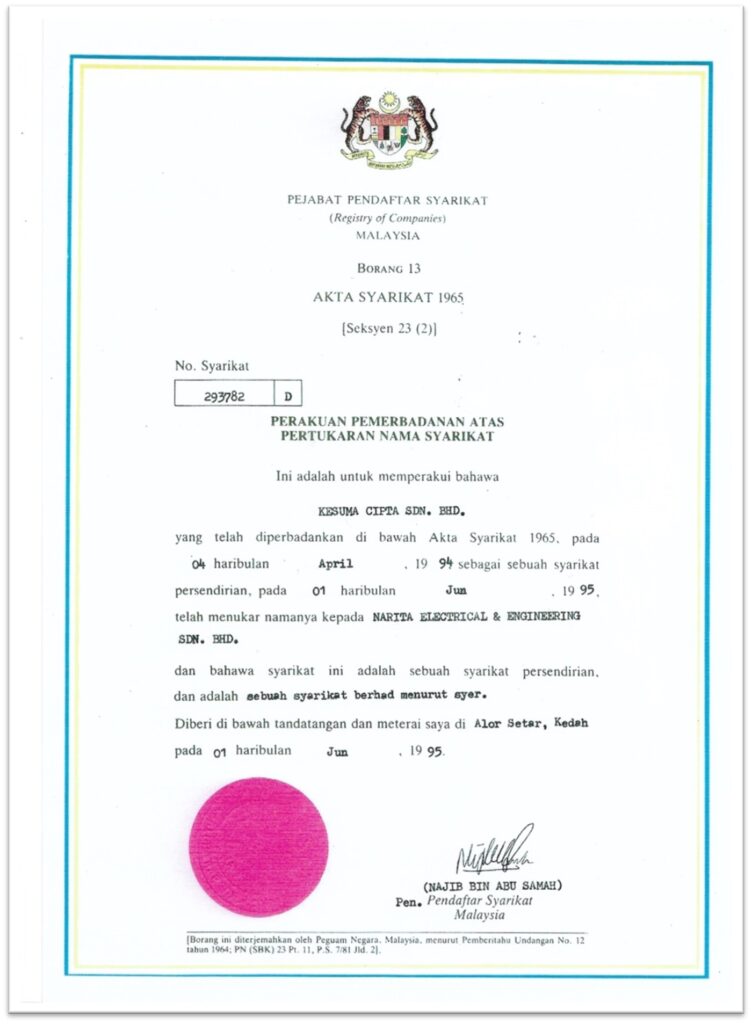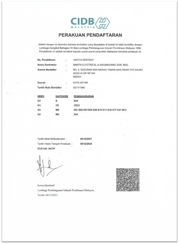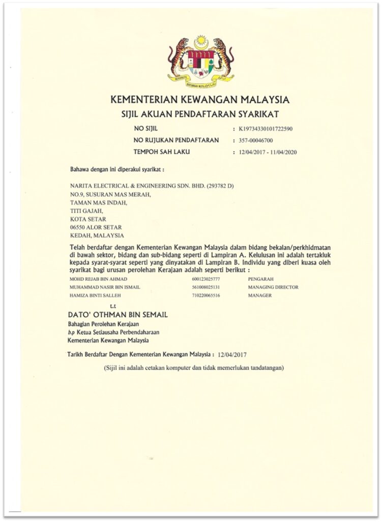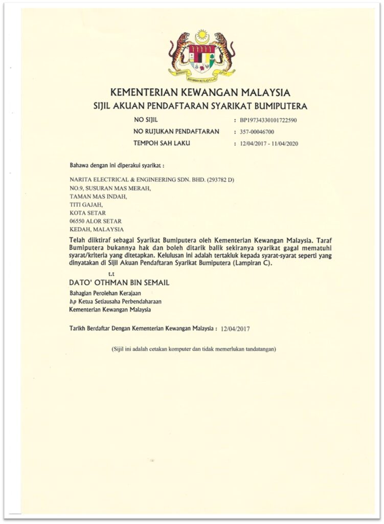 Narita Electrical & Engineering Sdn Bhd (293782 D) is a bumiputera status company incorporated on 1st June 1995. The company now operates at the premises at No. 9, Susuran Mas Merah, Taman Mas Indah, Titi Gajah 06550 Alor Setar, after 20 years of operating in Bandar Darulaman, Jitra.