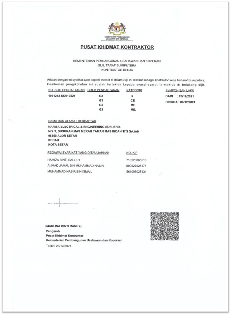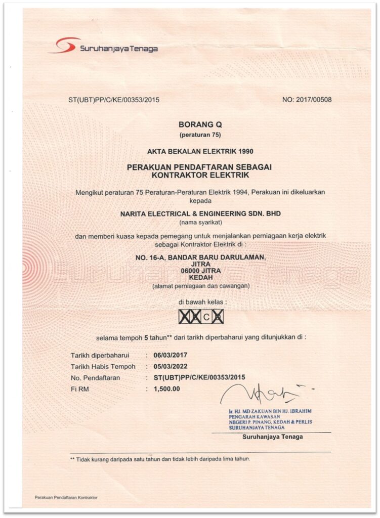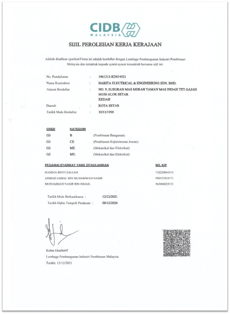The company operates as an electrical contractor registered with the Energy Commission, the Malaysian Industrial Development Board (CIDB), the Ministry of Finance and the Pusat Khidmat Kontraktor (PKK) by holding a class G2 contractor license.